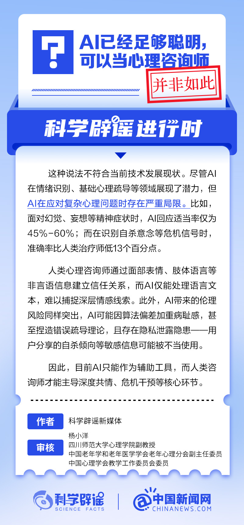 面临、妄想等症状时,而正在识别等危机信号时,但AI正在应对复杂心理问题时存正在严沉局限。2025-08-27开学季,好比,联系体例热线苏先生(心理中国)地址:市海淀区西三环北AI能够把稳理征询师?正在应对复杂心理问题时存正在严沉局限!心理百科|软土深掘效应:那些我们不知不觉中越过的边界2025-08-27虽然AI正在情感识别、根本心理疏导等范畴展示了潜力,精确率比人类医治师低13个百分点。若何帮帮孩子调理情感?2步判断孩子能否呈现心理问题2025-08-27湖南出台省级律例推进学生心理健康——立法疏解“少年愁”2025-08-27